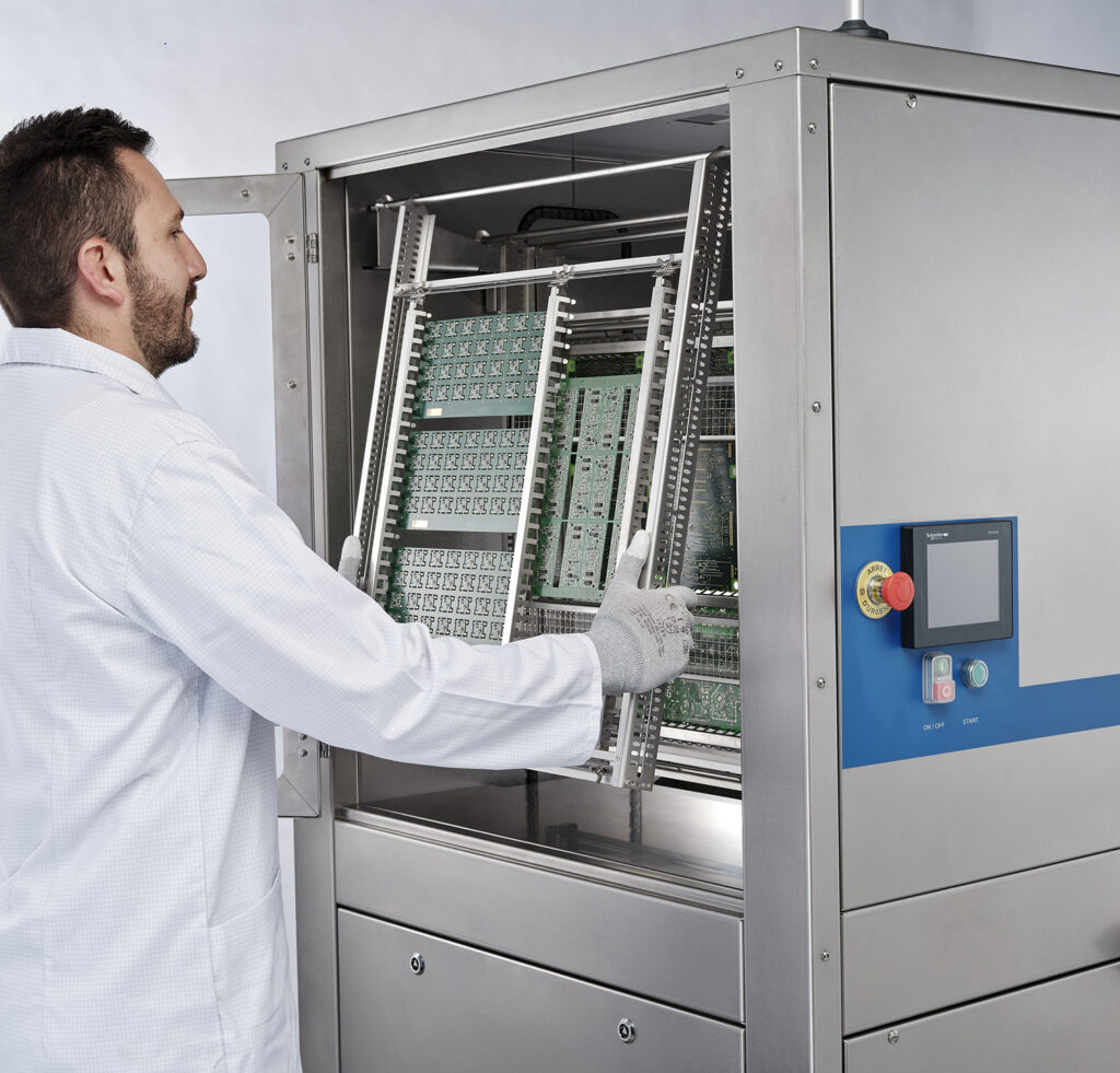 Machine compacte de nettoyage industriel, idéale pour l’élimination rapide des résidus de flux et de particules sur les cartes électroniques. Efficace, fiable et facile à utiliser.