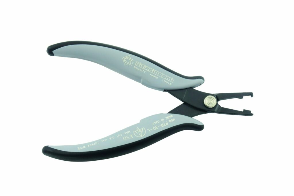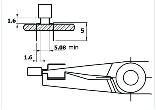 Tool that forms the component lead in an L shape and cuts off the residual part. Steel thickness 3mm. Tool length 150mm. ESD-safe handles. Grip model St