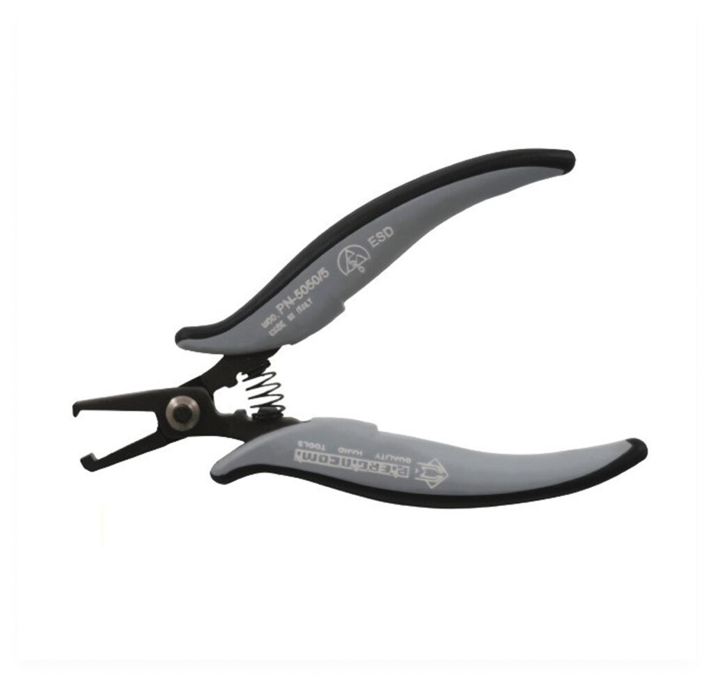 La pince à bec courbé est un outil dont les mâchoires fines sont inclinées à un angle, facilitant l’accès et la manipulation dans des espaces restreints ou difficiles d’atteindre.